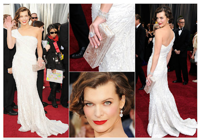 Milla Jovovich brilhou muito vestida com  Elie Saab e com batom vermelho.
