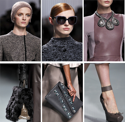 Os acessórios são gorros de tricô, óculos, maxi-jóias, luvas de couro,sapatos de salto que remetem ao universo da dança, bolsas com pedrarias e peles.